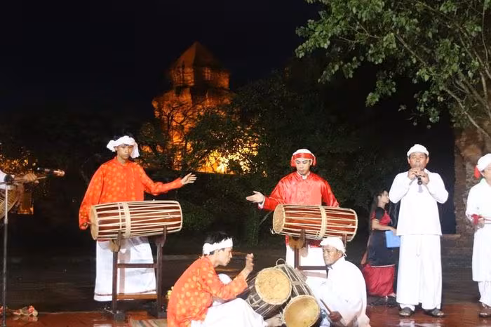 Khi màn đêm buông xuống, tiếng trống ginăng và tiếng kèn saranai vang lên, mở đầu cho buổi biểu diễn nghệ thuật dân gian Cham. Ánh đèn vàng dịu chiếu lên tường đá, làm nổi bật các hoạ tiết chạm khắc tinh tế, tạo nên bầu không khí vừa trang nghiêm vừa sống động.