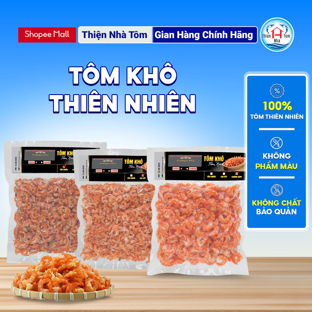 Tôm khô thiên nhiên là sản phẩm được làm từ tôm tươi, không qua xử lý hóa chất hay chất bảo quản. Quá trình sản xuất tôm khô thiên nhiên thường diễn ra theo các bước: lựa chọn tôm tươi, sơ chế, phơi nắng hoặc sấy khô để loại bỏ độ ẩm, và cuối cùng là đóng gói bảo quản. Tôm khô thiên nhiên có đặc điểm màu sắc tự nhiên, không bị phai màu hay đổi màu như các sản phẩm tôm khô khác.